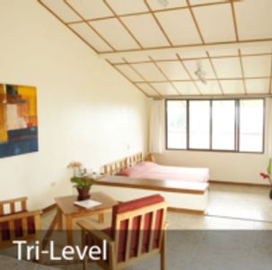 An open floorplan with three defined living spaces cascading down from each other. Step down a level from the entryway to the lounge, then to the bedroom. Option of king-size or two twin beds. Tri-Level rooms can accommodate 3 to 4 guests on request.